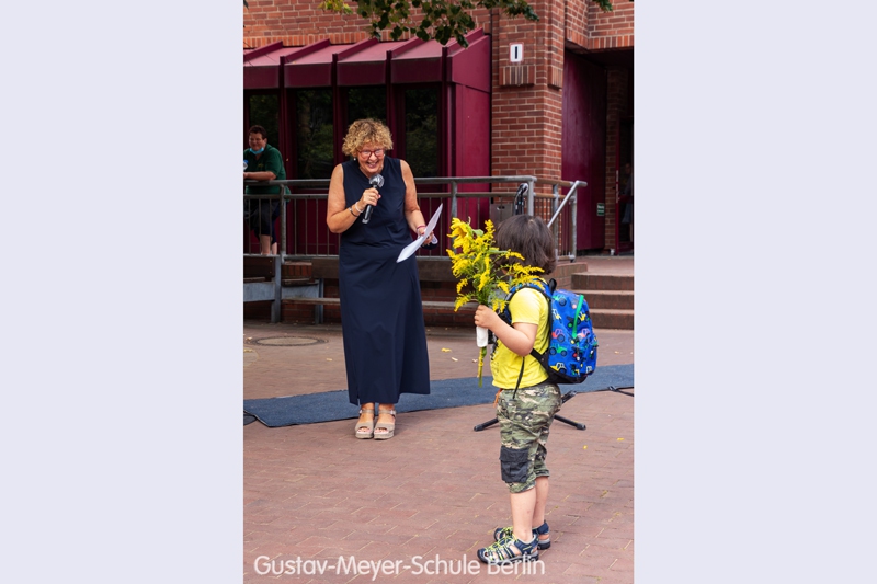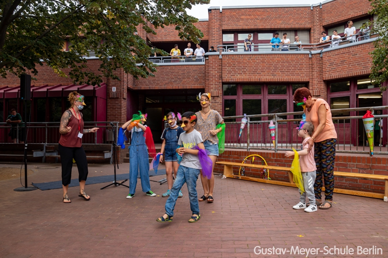 Auf dem Schulhof war für jeden der kleinen ABC-Schützen und dessen Gäste ein eigener Tisch aufgebaut, so konnten die Abstandsregeln gut gewahrt werden. Frau Steinke, die Schulleiterin, begrüßte alle herzlich und dann gab es ein kleines, aber feines Programm. Der Schulchor brachte Stimmung auf den Hof, dann gab es ein kleines musikalisches Highlight der Unterstufe mit bunten Kostümen und einem lustigen Lied über ein ängstliches Vogeljunges. Von der Veranda aus schauten viele Klassen dem bunten Treiben auf dem Schulhof zu.