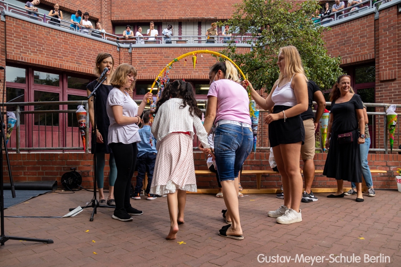 Nach der Begrüßung gingen die Kleinen zum ersten Mal mit ihren Lehrerinnen und den anderen Kolleginnen der Klassenteams in ihre Klassenzimmer. Die Eltern und die übrigen Gäste blieben währenddessen auf dem Schulhof zurück und  wurden vom Schulchor musikalisch unterhalten.