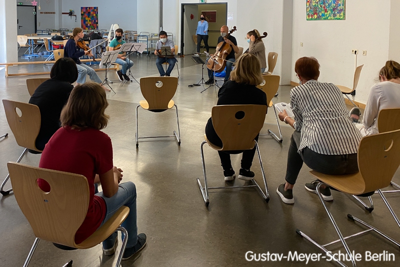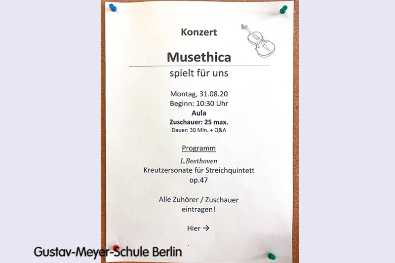 Corona legt leider vieles still, darunter leiden besonders viele Künstler. Umso schöner war es, dass uns die Musiker des Musethica den letzten Tag im August mit ihrer wunderbaren Musik versüßten! Es durften leider nur höchstens 25 Zuhörer in die Aula. Dennoch war das für alle eine willkommene Abwechslung und ein Genuss für die Ohren.