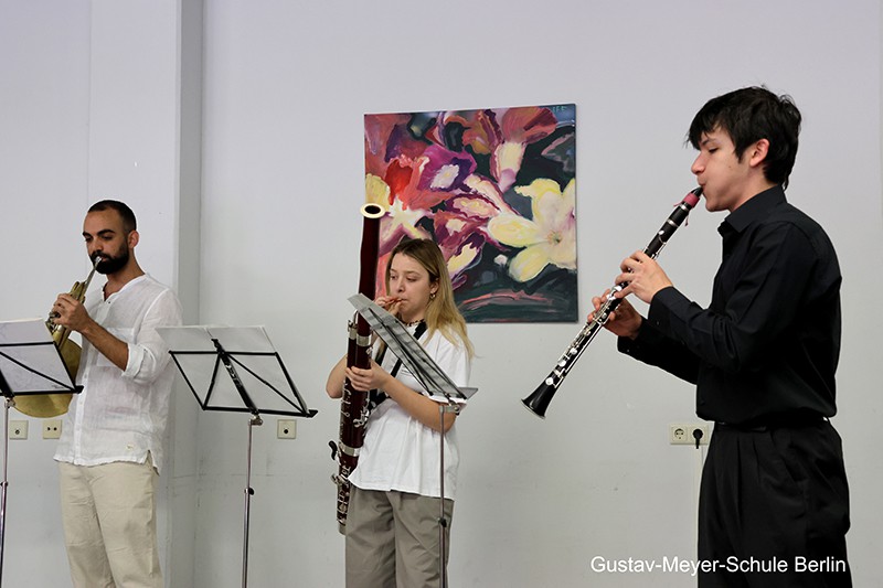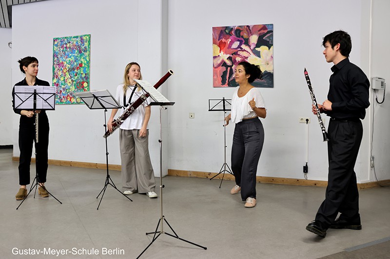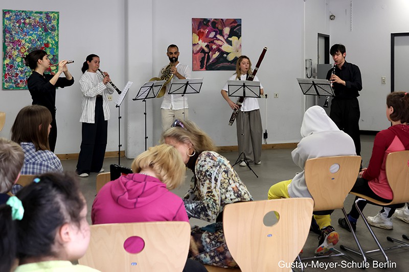 Carla Garcia Heredea an der Flöte, Rafaela Carvalho an der (wirklich beeindruckenden…) Oboe, Ibrahim Alshaikh an der Klarinette, Nur Koç am Fogott und Dor Yadlin am Horn bereiteten uns eine wundervolle Vorstellung. Ihre Tutorin Mor Biron stellte sie vor und führte durch’s Programm. Sie spielten Werke von Mozart, Milhaud und Hindemith, – es war toll und die Schülerinnen und Schüler waren begeistert!