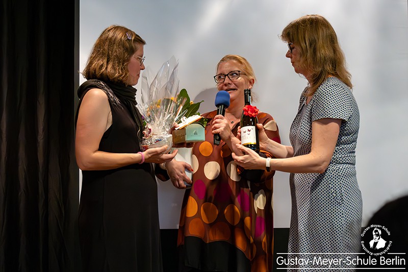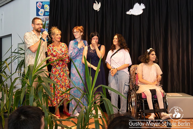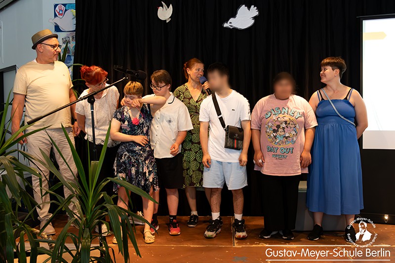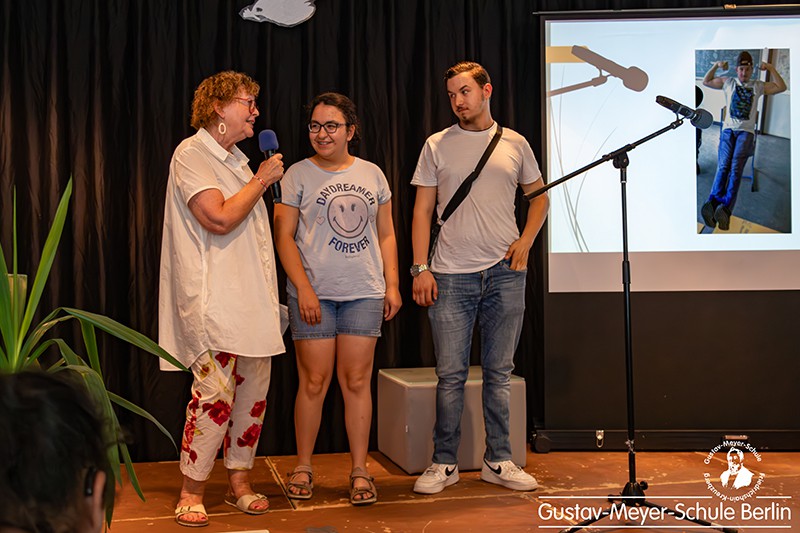Die Abschluss-Schüler wurden von ihren Lehrern einzeln auf die Bühne geholt und mit liebevollen Worten bedacht, dazu sahen wir jeweils ein älteres und ein neueres Foto. Man konnte sehen, wie aus den kleinen Schülern in den Jahren an der Gustav-Meyer-Schule tolle junge Frauen und Männer wurden. – Ach, wir sind so stolz auf Euch!