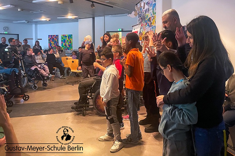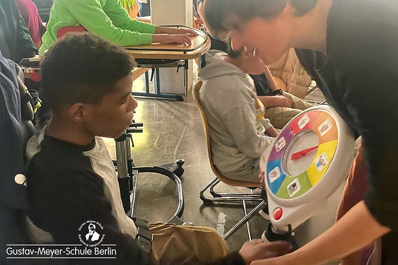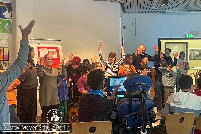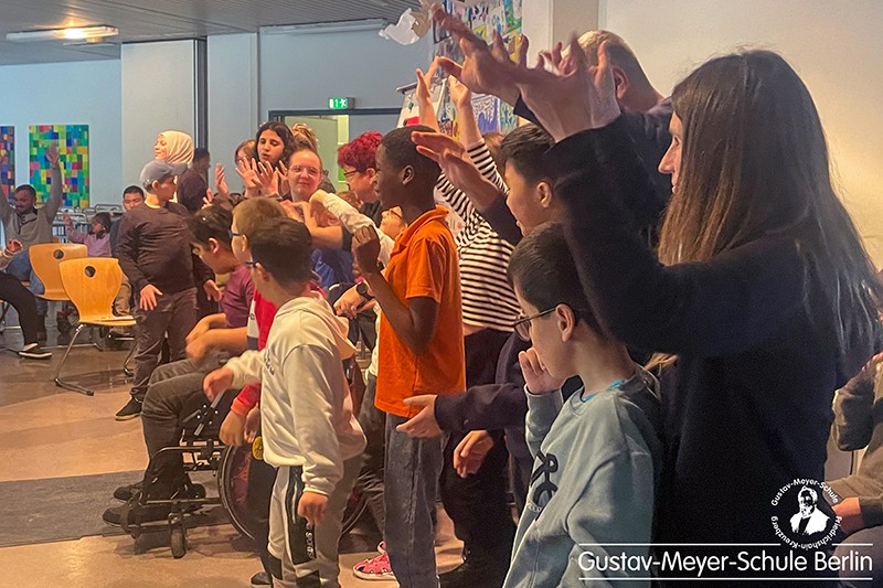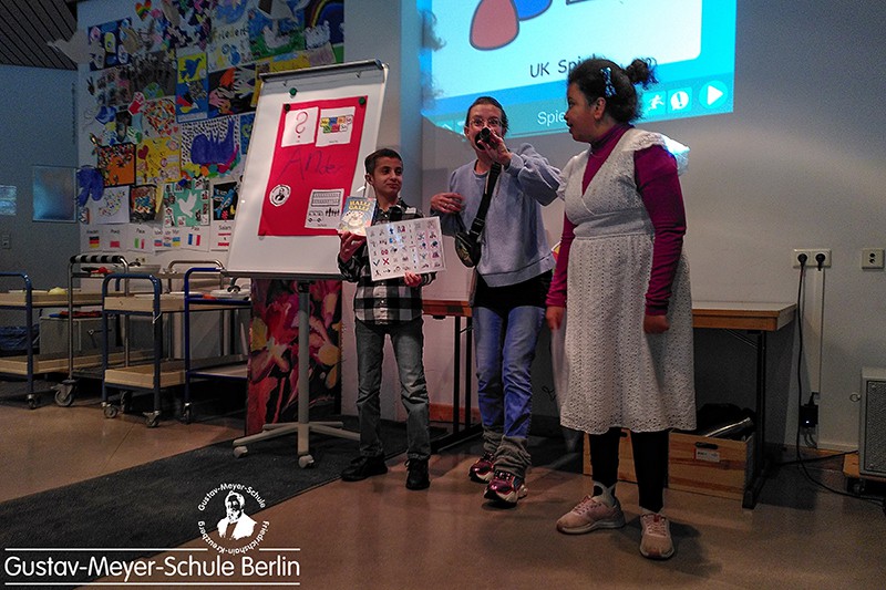 In der vergangenen Woche fanden an der Gustav-Meyer-Schule von Montag, dem 30. September bis Mittwoch, dem 2. Oktober Projekttage zum Thema UK statt. Es gab vieles zum Lernen, Mitmachen und als Anregung zu sehen und machte wieder großen Spaß! So gab es unter anderem ein Mitmachspiel mit dem Glücksrad. Durch Drücken konnte bestimmt werden, was alle machen sollten, z.B. Jubeln. Das war lustig! Dann gab es die Frage, „Wie war es?“ Einzelne Schülerinnen und Schüler meldeten sich zu Wort und drückten ihre Begeisterung aus.